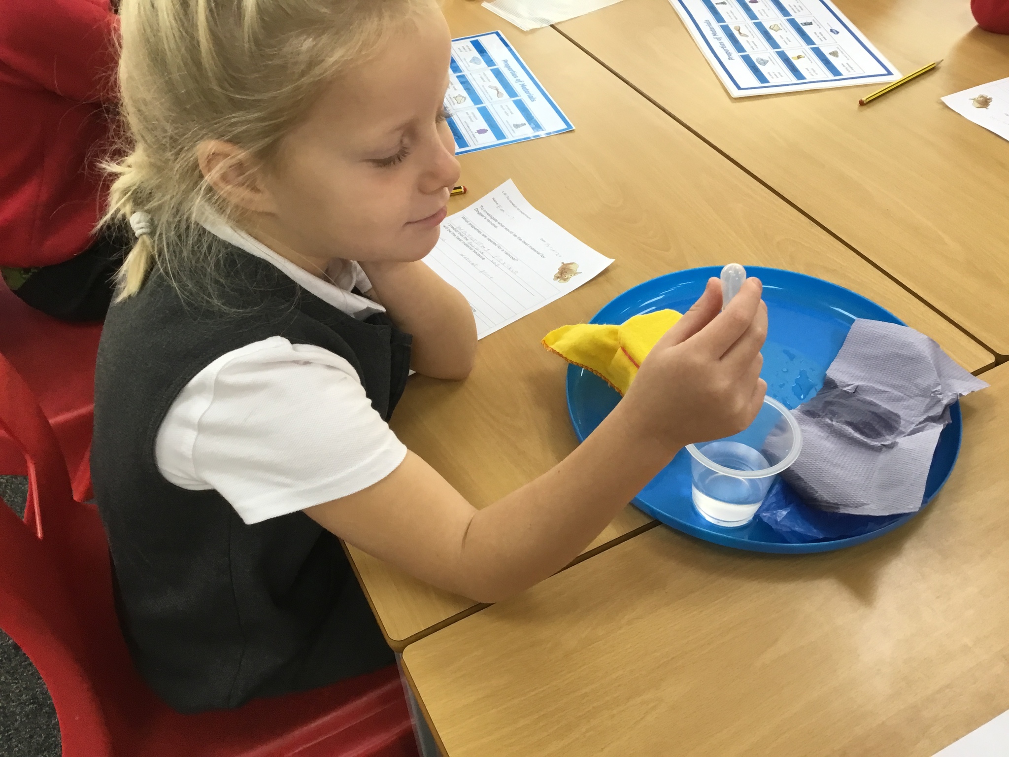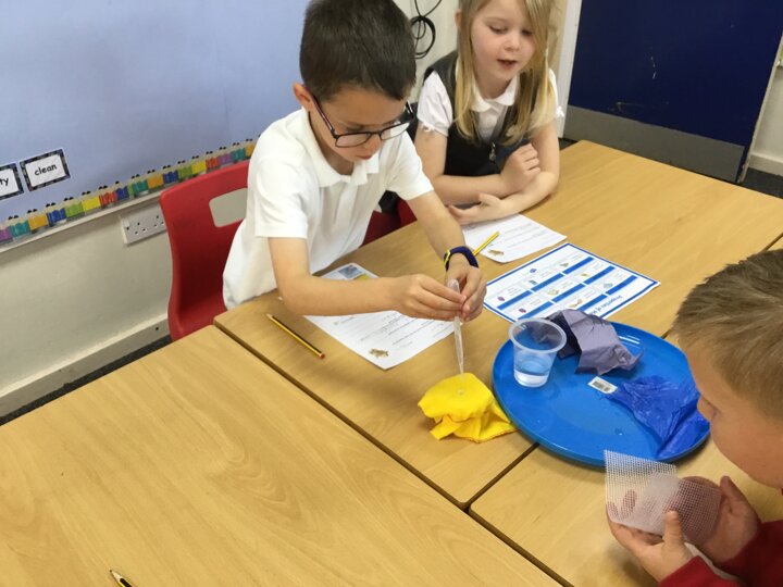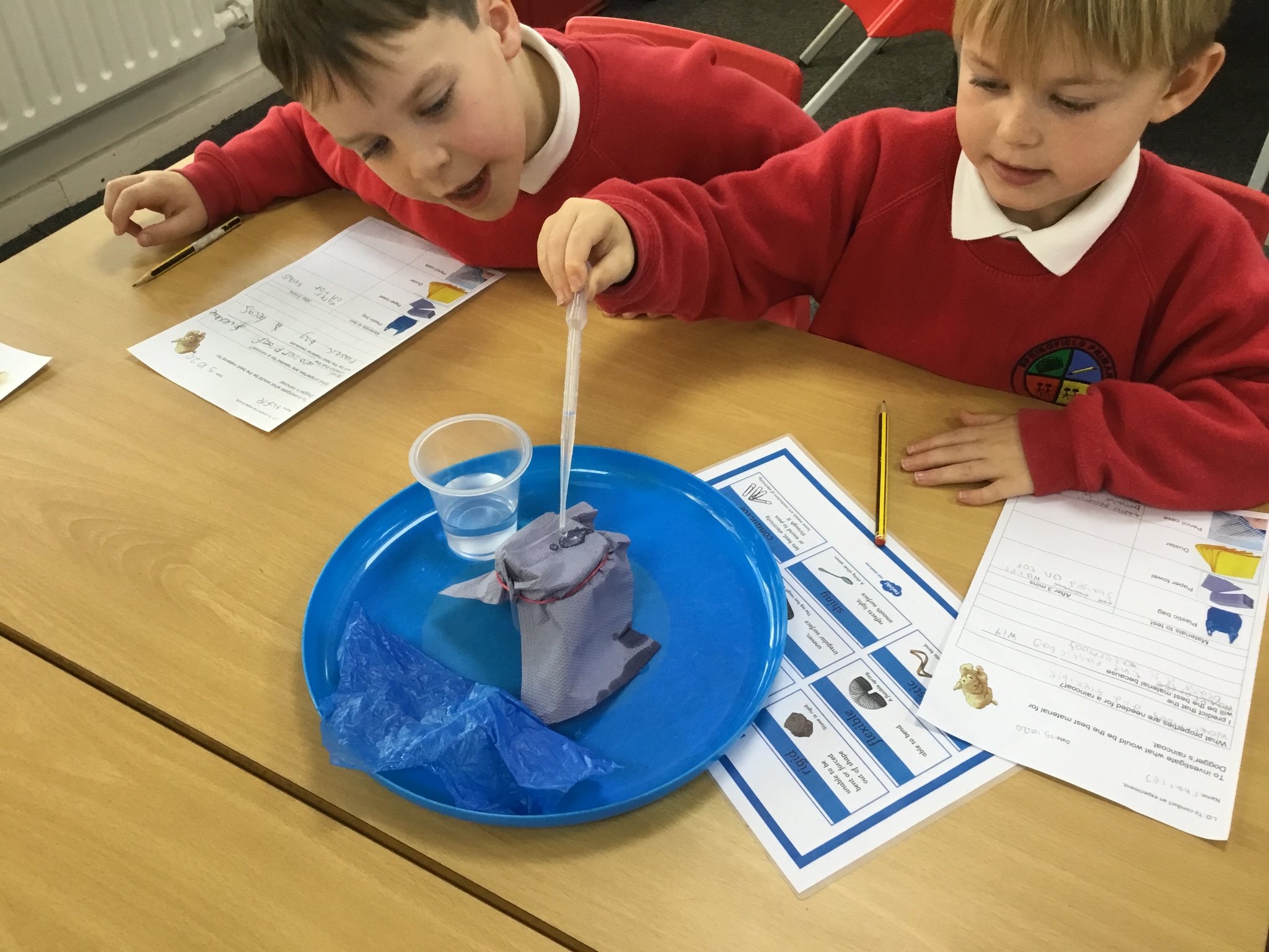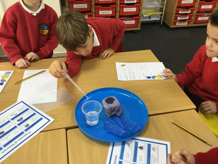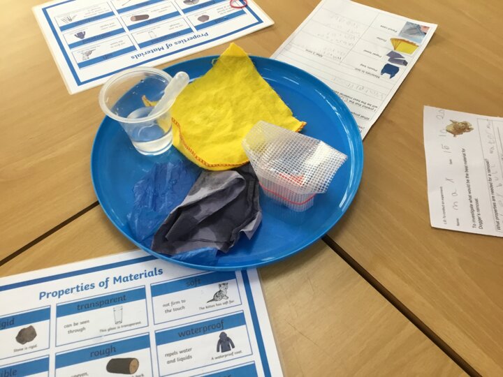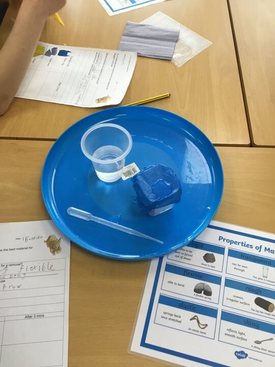 We were testing materials to see which would be the best material for a raincoat for Dogger. We thought about what we had already learnt about the properties of materials and predicted which material would be best. We then tested them to see if our predictions were correct.