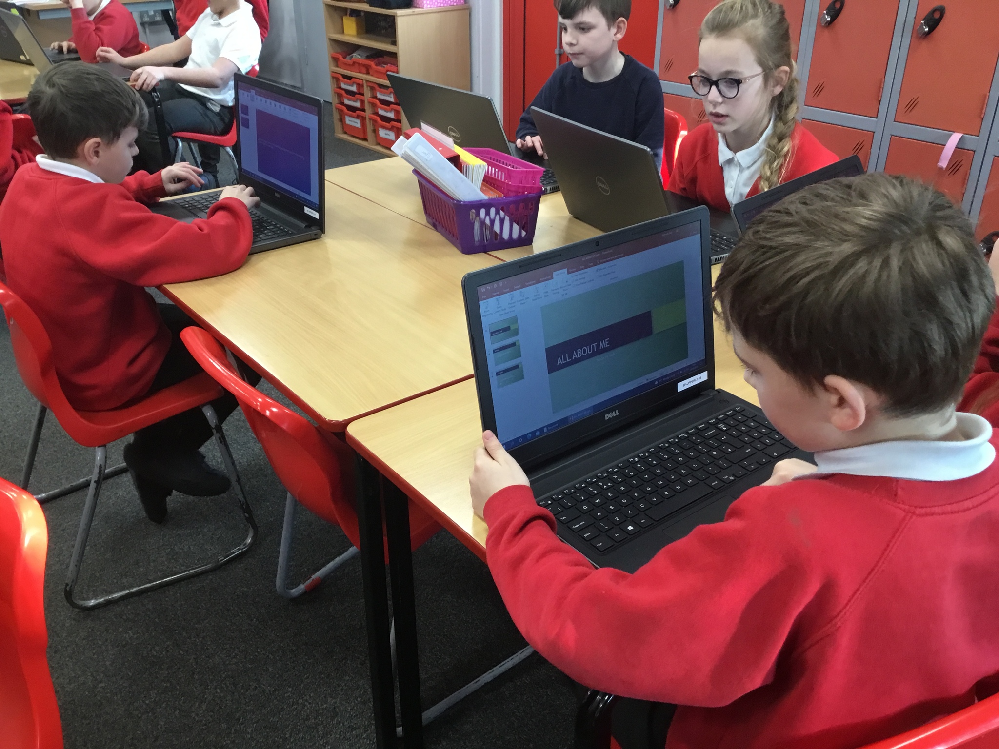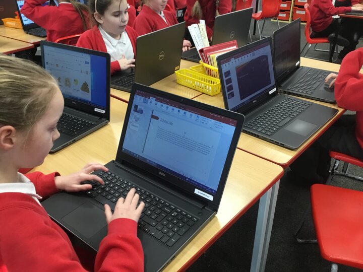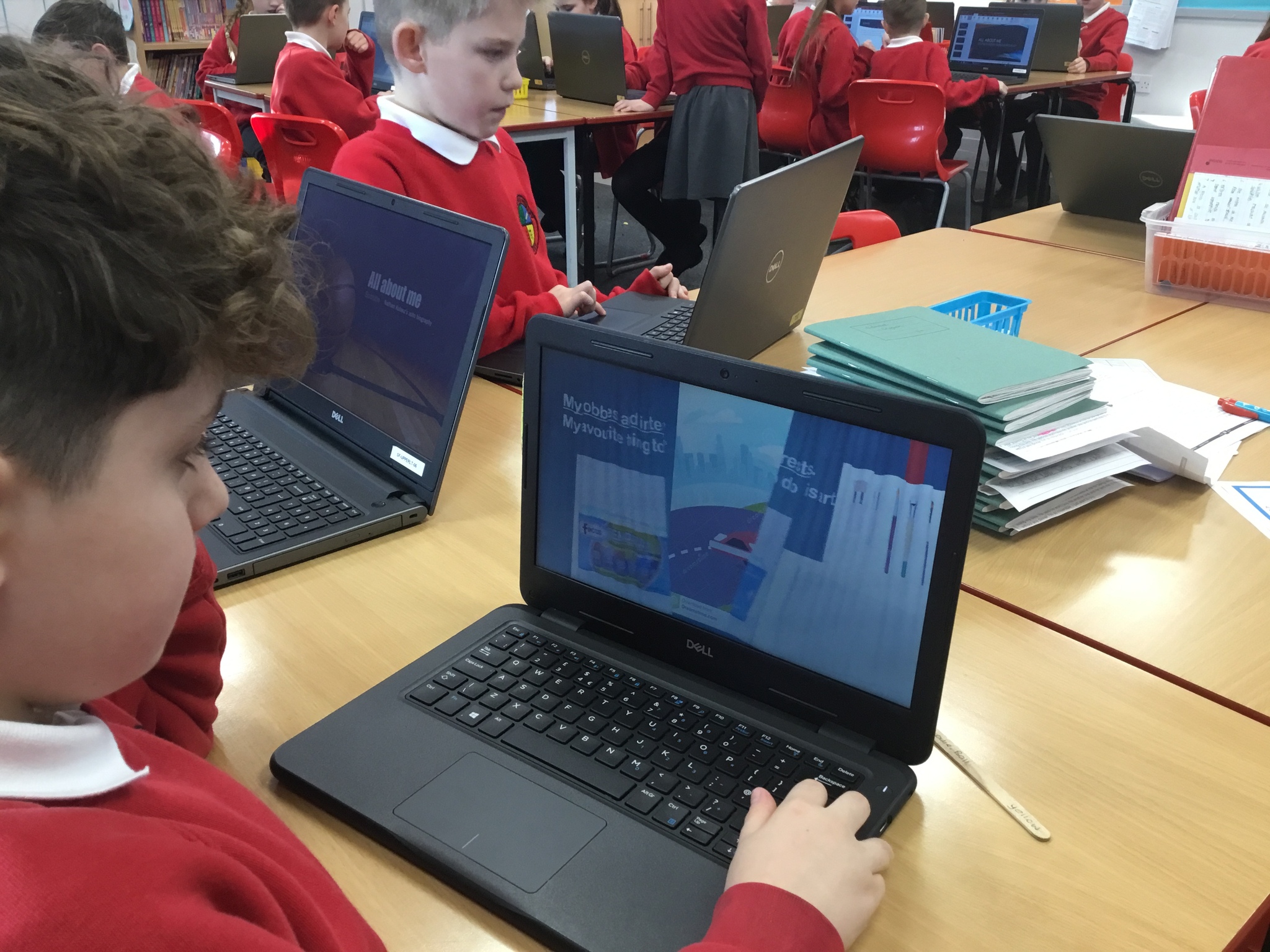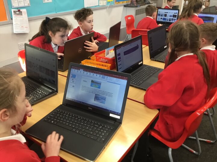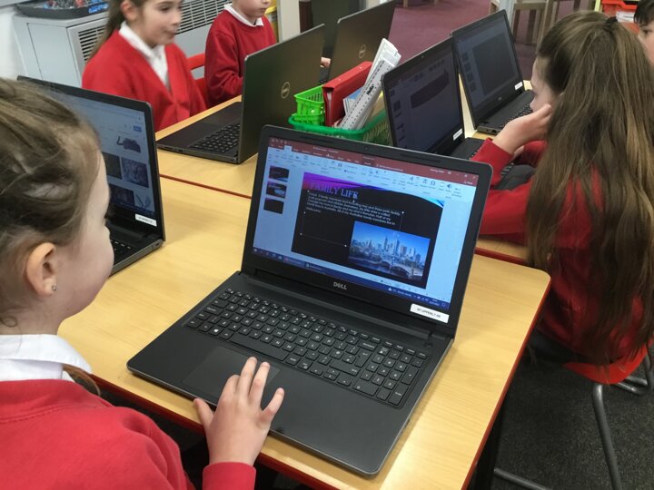In computing, Year 3/4 have been making PowerPoints titled 'All about Me.' They have learnt to select themes, insert text boxes and new slides, edit and format text, insert pictures and change transitions.