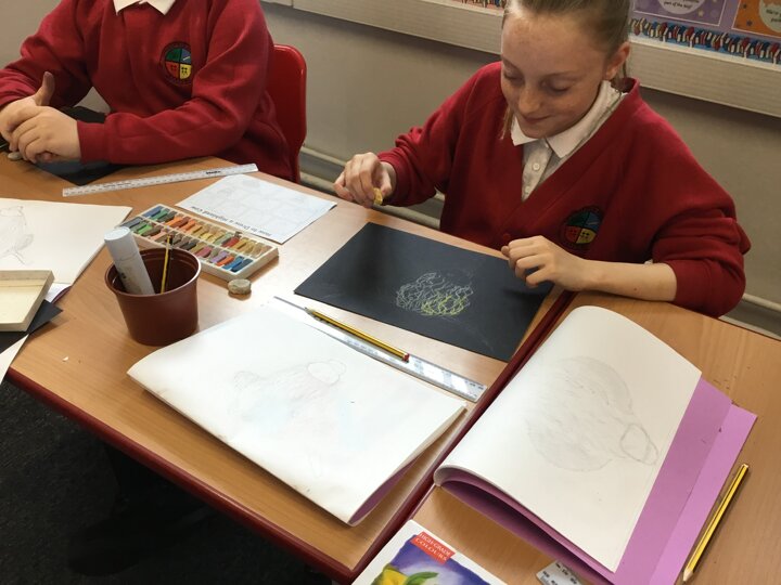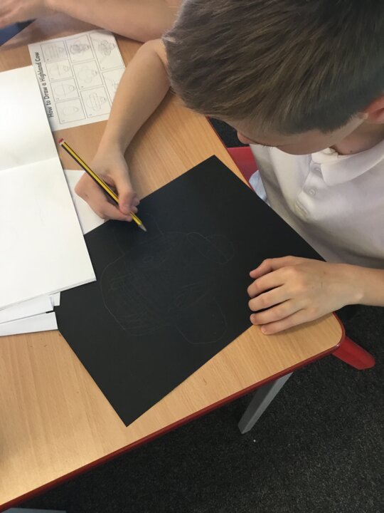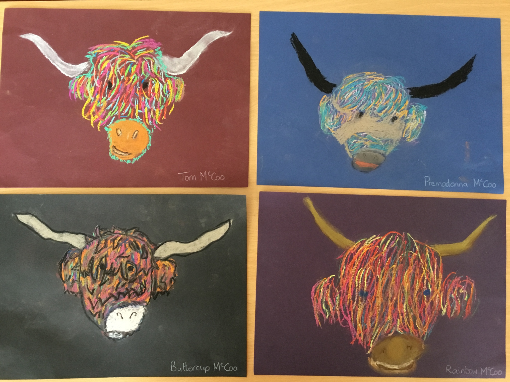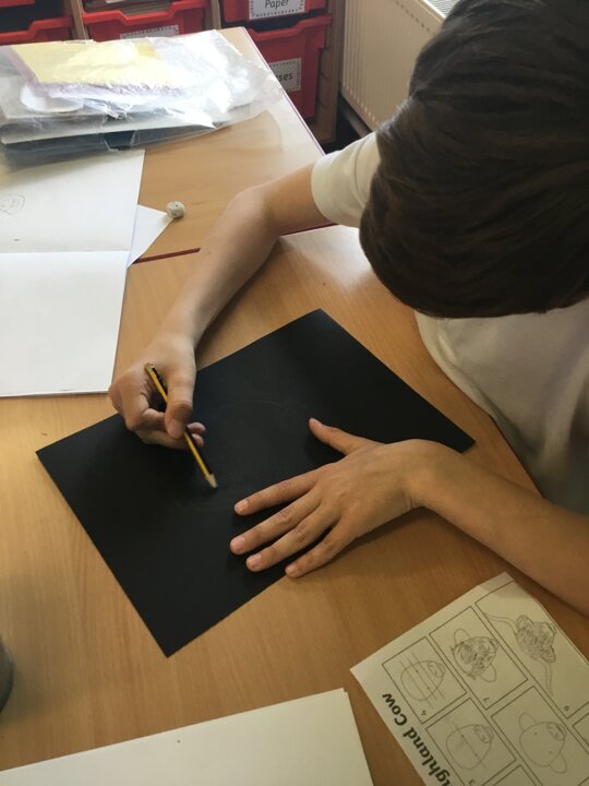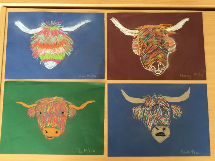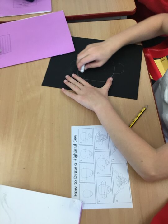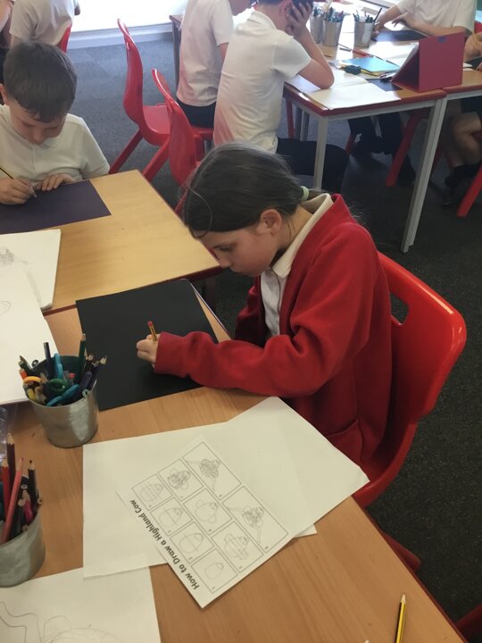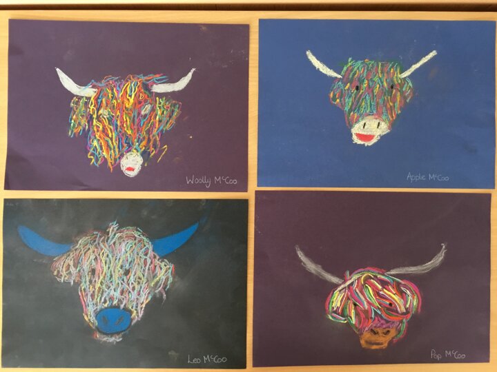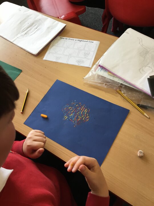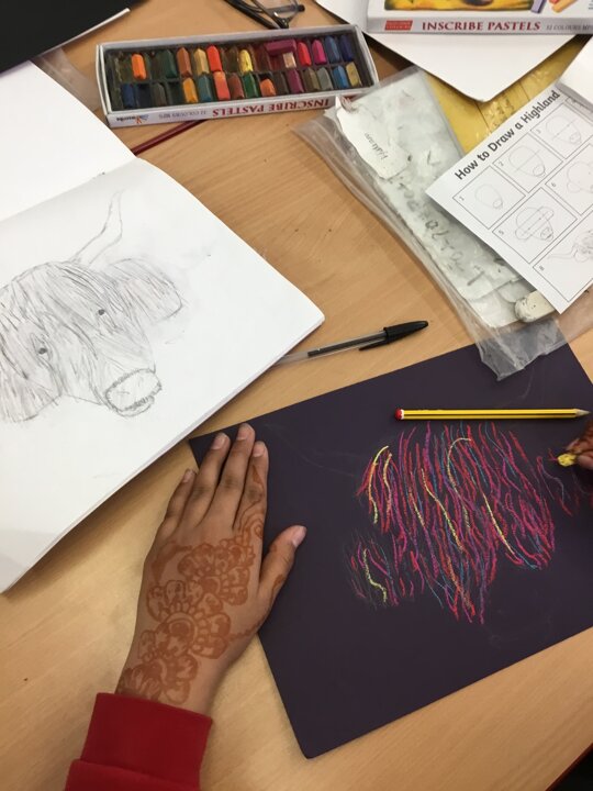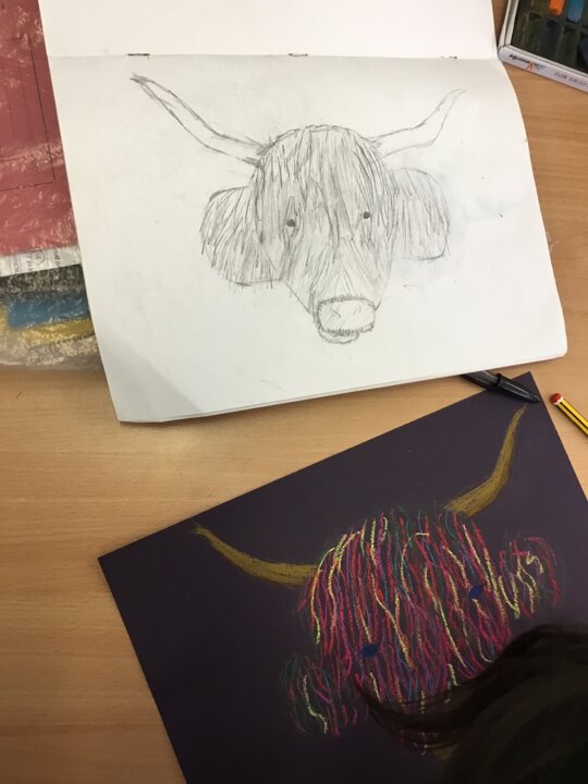 In art this week, Year 5 and 6 have been replicating the artwork of Steven Brown’s famous McCoo paintings. We started by sketching a highland cow following a step by step guide. Once we were confident with our sketches, we then redrew them onto dark card with a pencil. We then added brightly coloured sweeps of pastel crayons to create the texture of the hair. We loved how bright and vibrant the end results were.