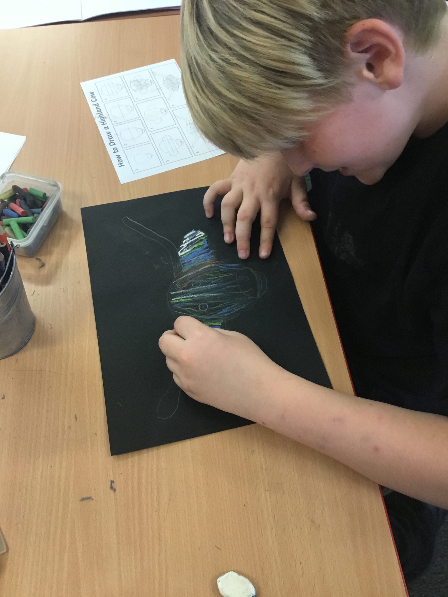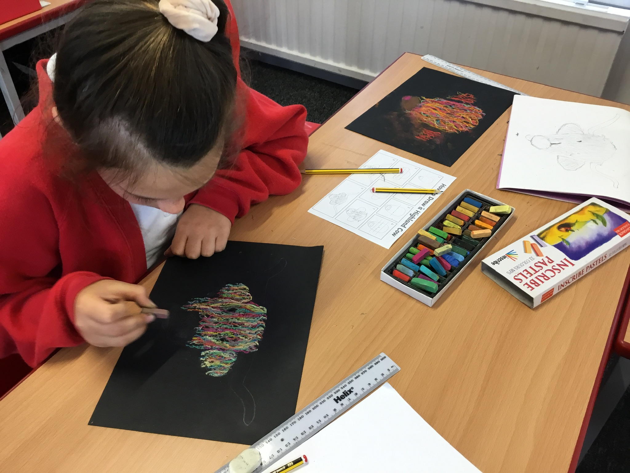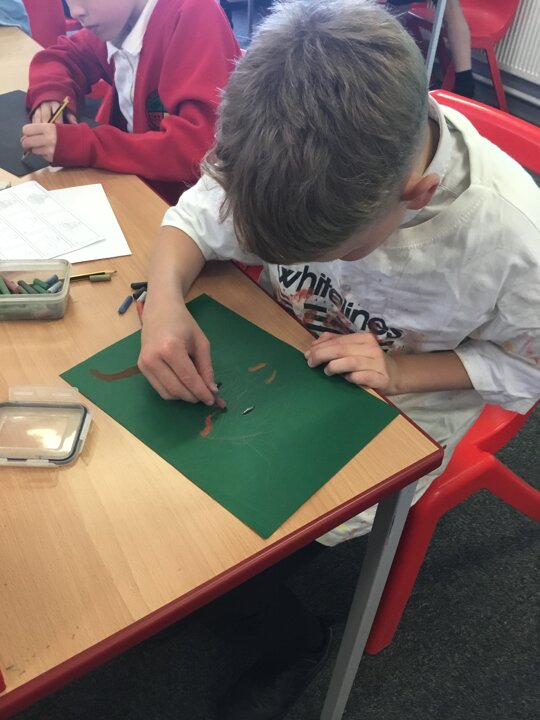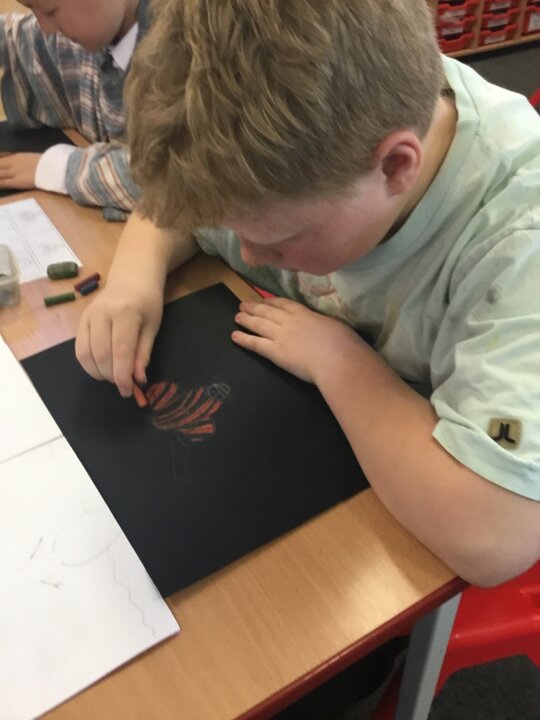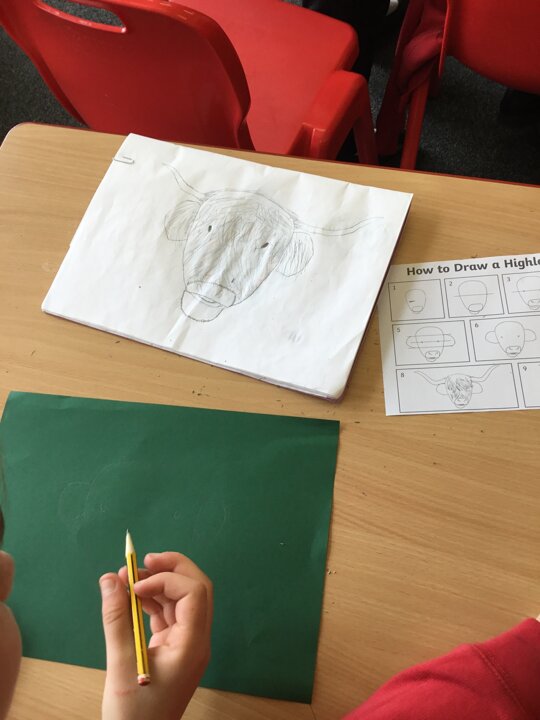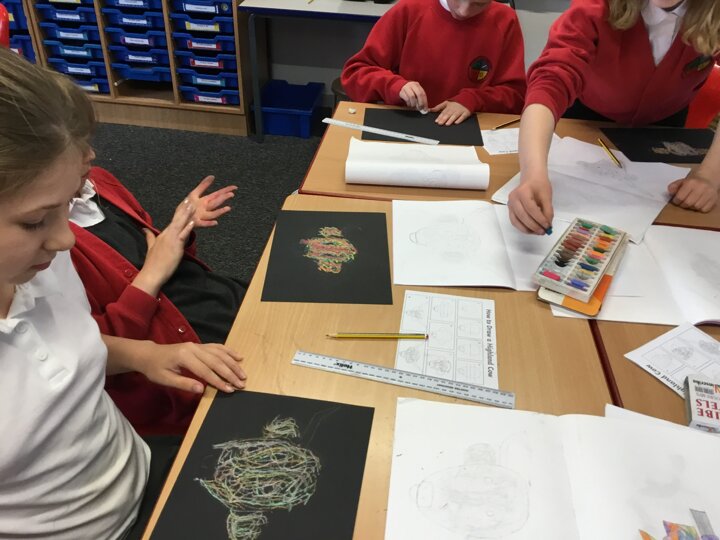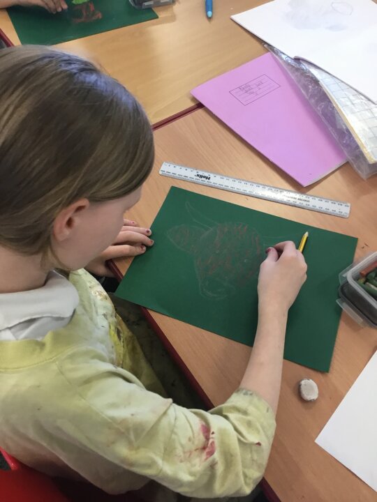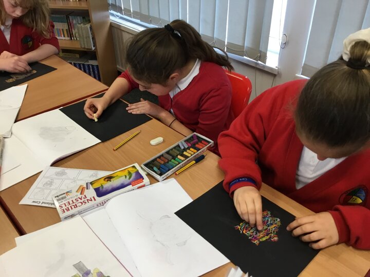 In art this week, Year 5 and 6 have been replicating the artwork of Steven Brown’s famous McCoo paintings. We started by sketching a highland cow following a step by step guide. Once we were confident with our sketches, we then redrew them onto dark card with a pencil. We then added brightly coloured sweeps of pastel crayons to create the texture of the hair. We loved how bright and vibrant the end results were.