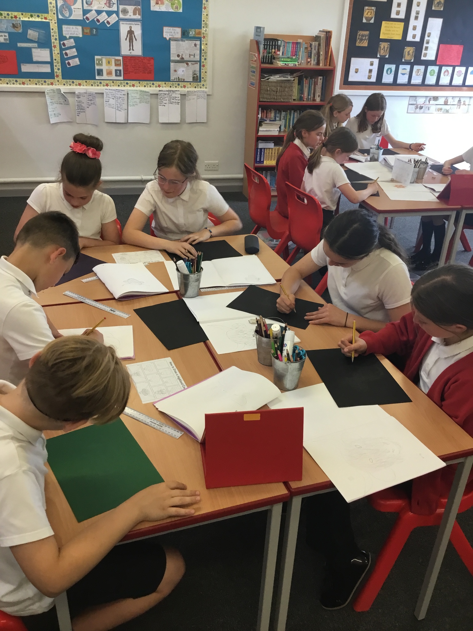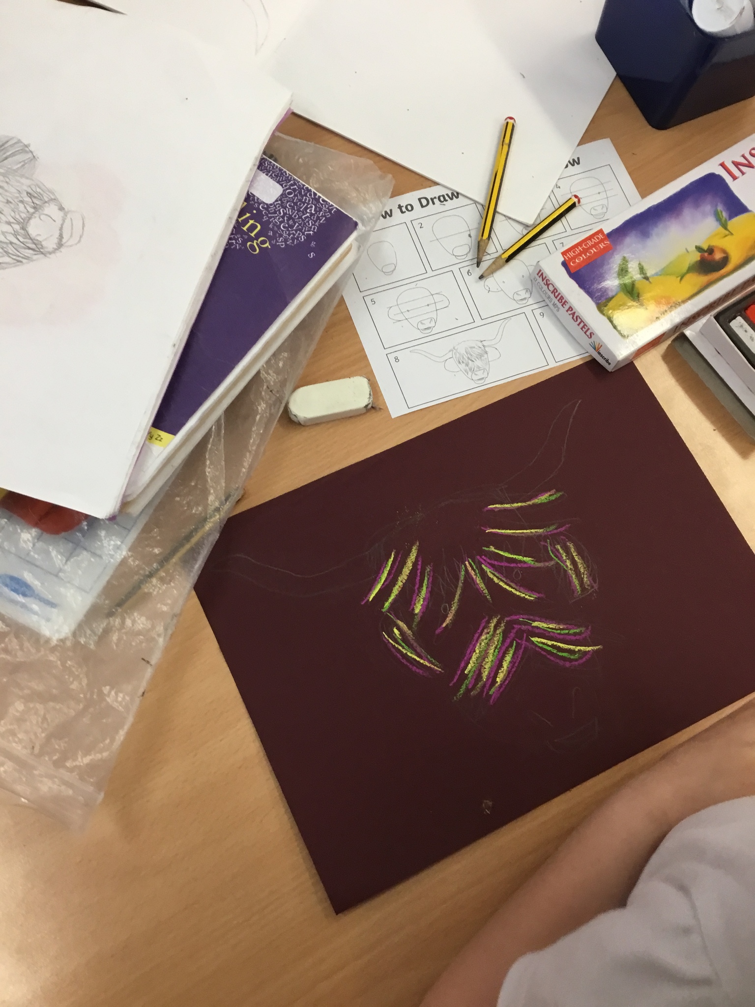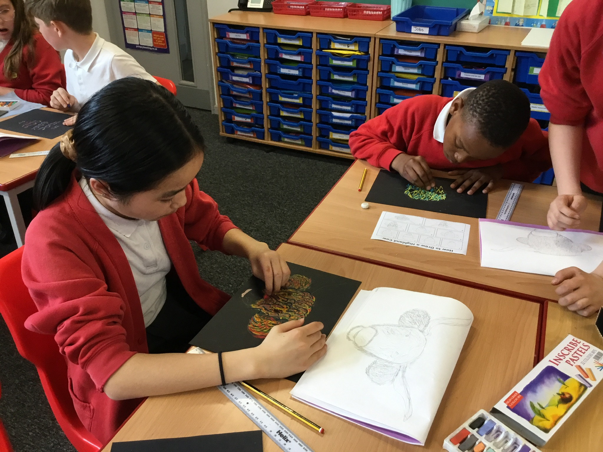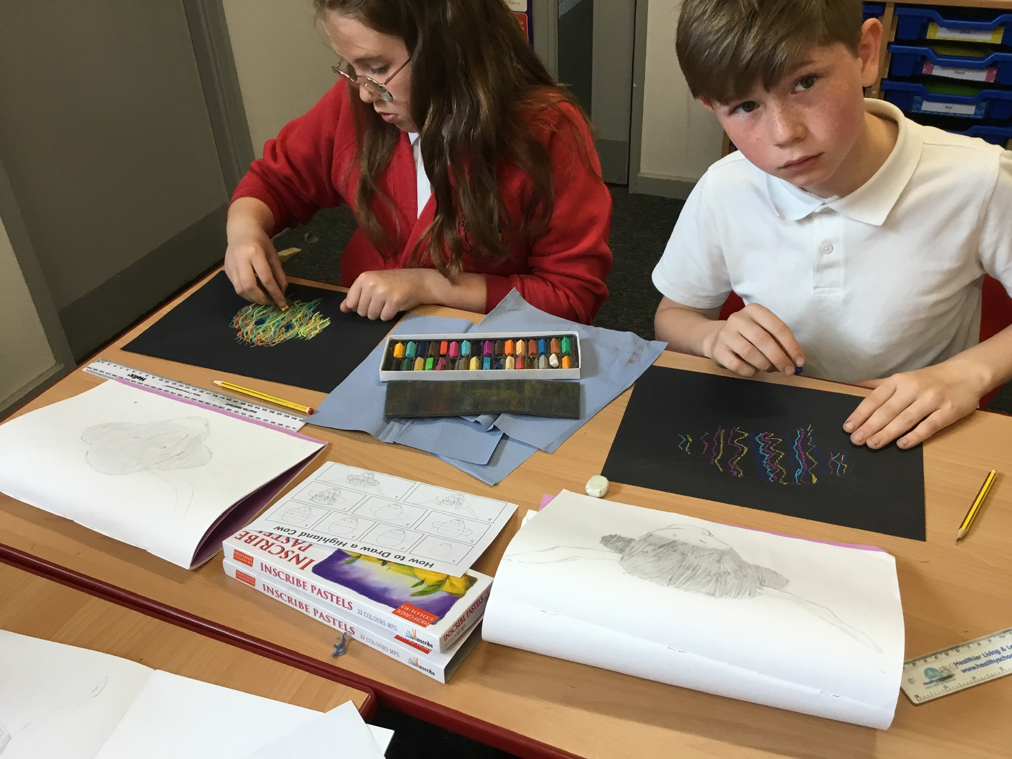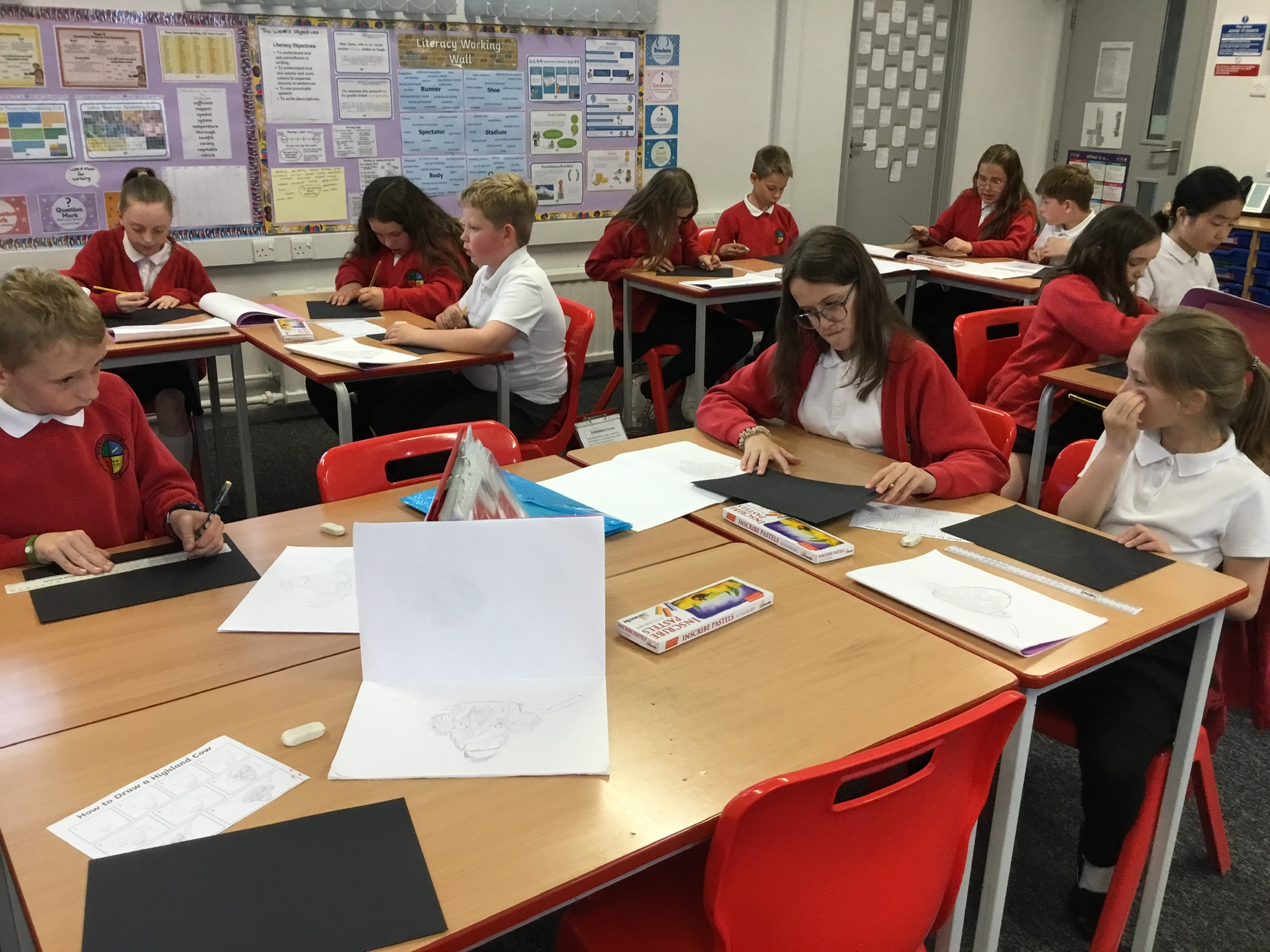 In art this week, Year 5 and 6 have been replicating the artwork of Steven Brown’s famous McCoo paintings. We started by sketching a highland cow following a step by step guide. Once we were confident with our sketches, we then redrew them onto dark card with a pencil. We then added brightly coloured sweeps of pastel crayons to create the texture of the hair. We loved how bright and vibrant the end results were.