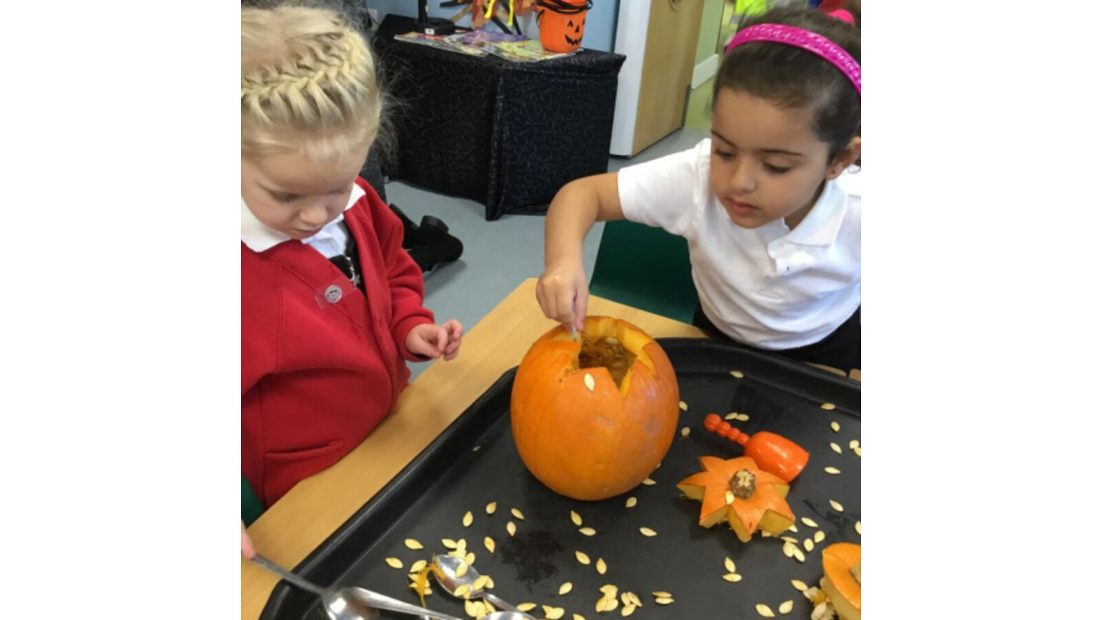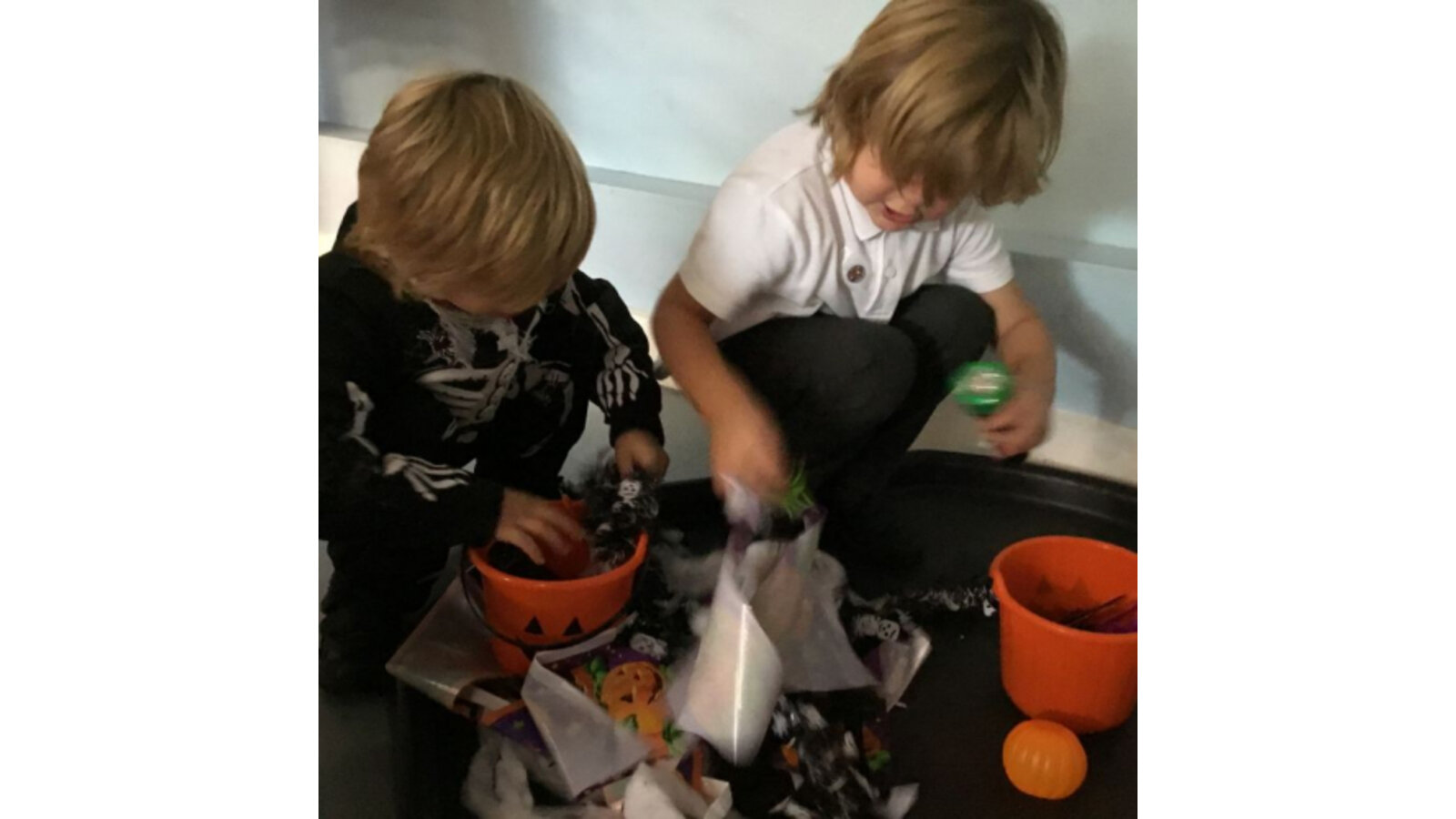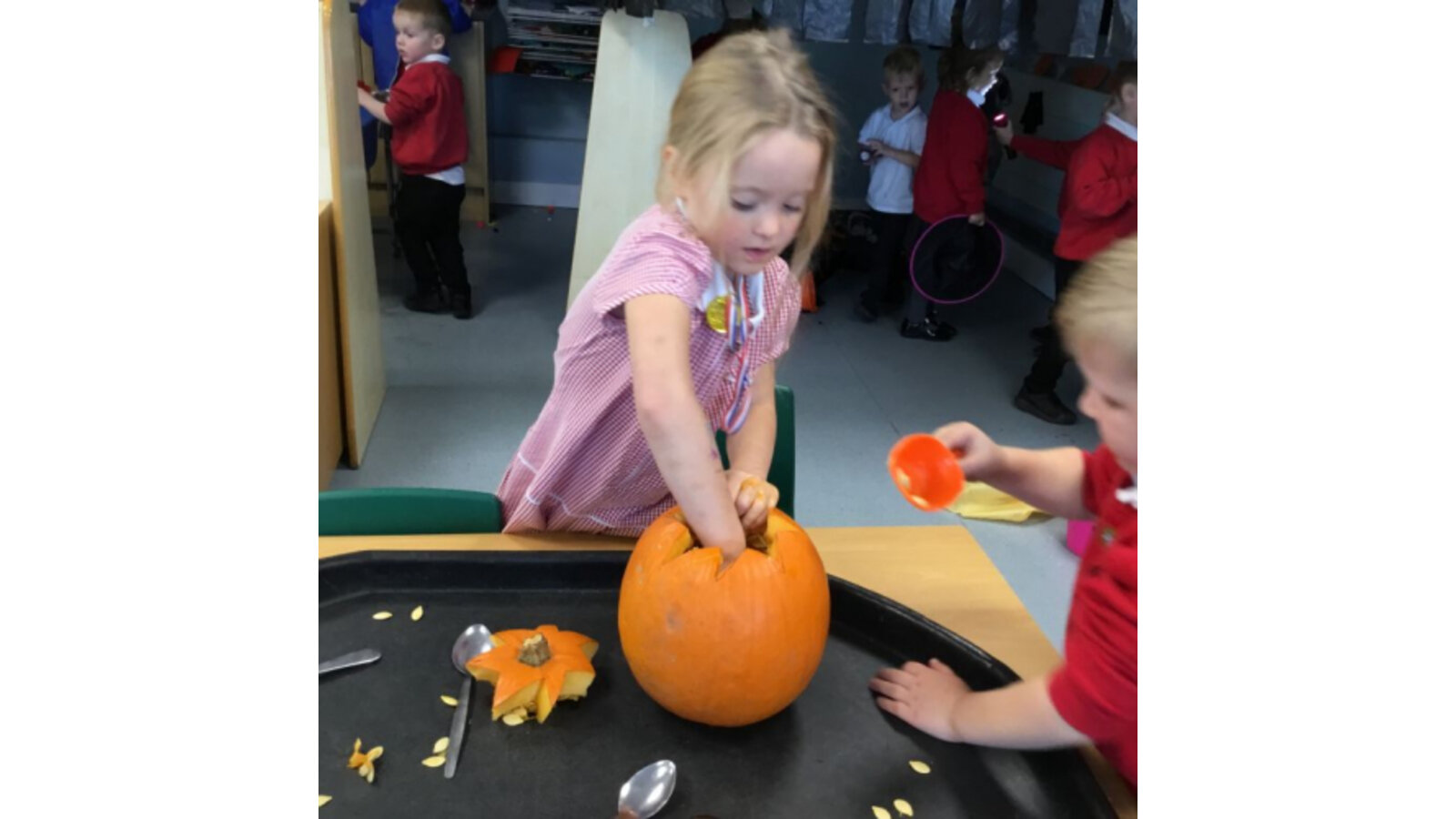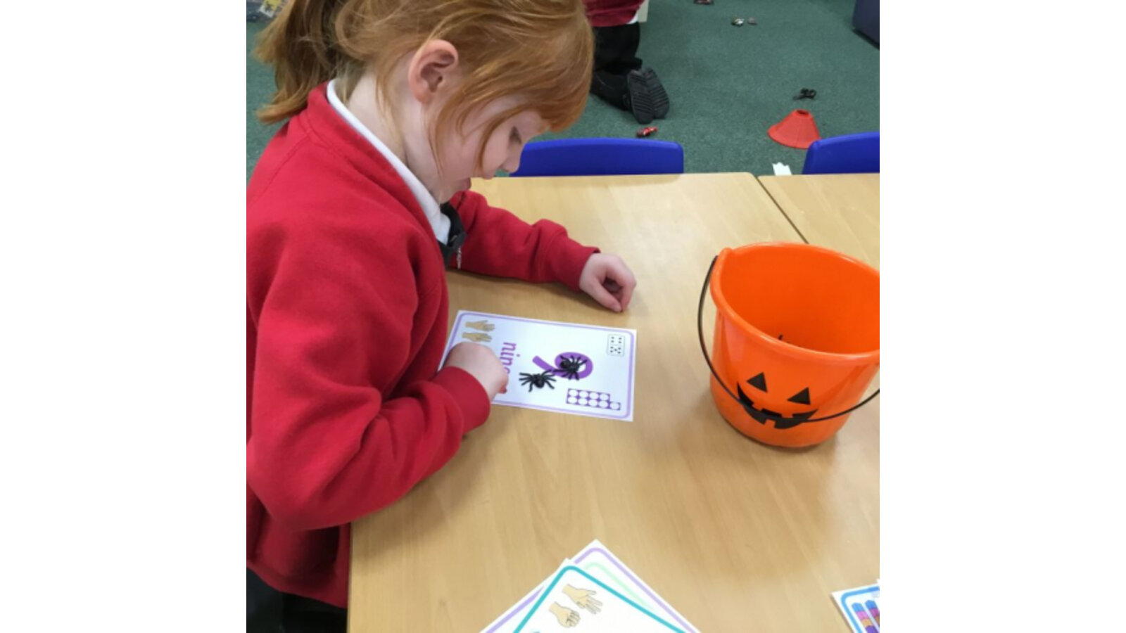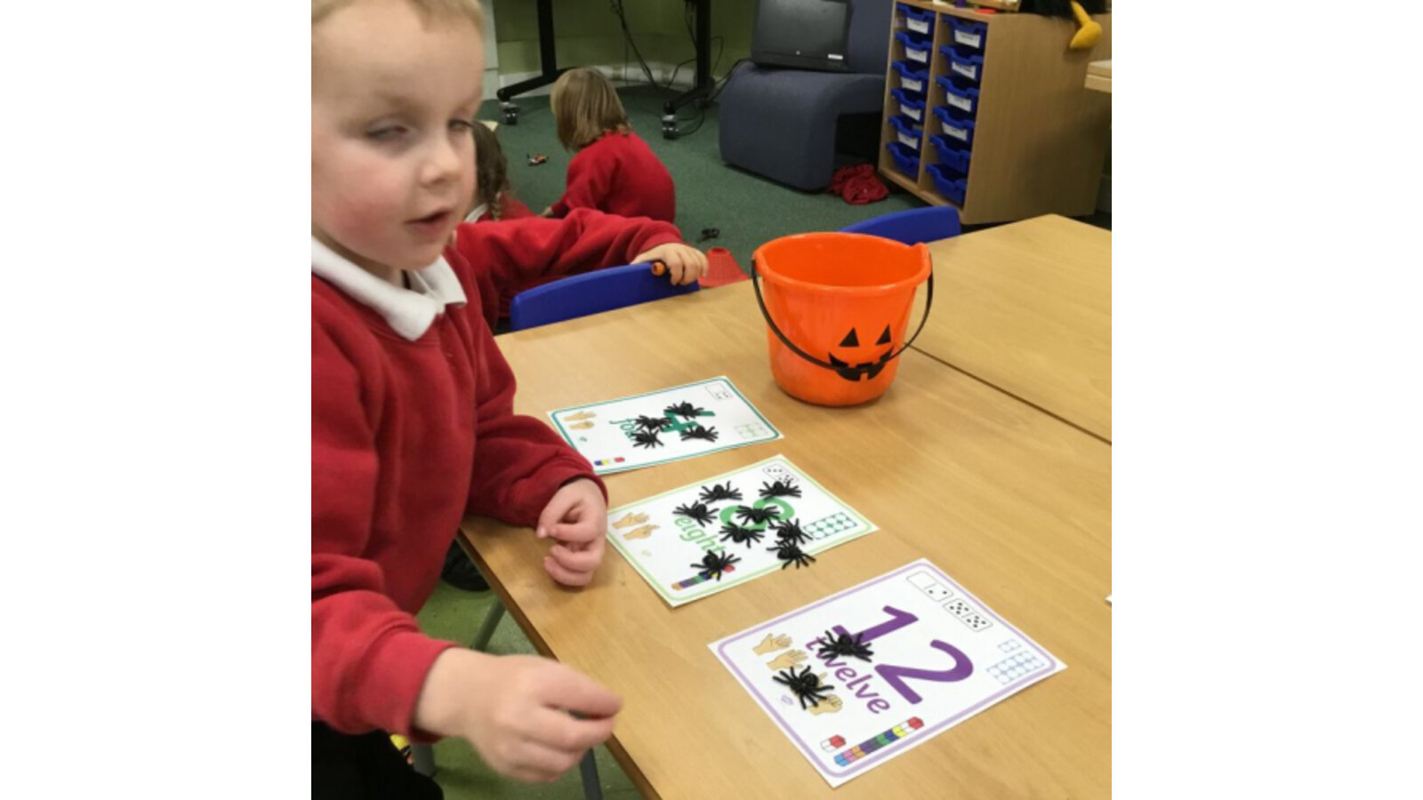 This week we have been reading Room on the Broom by a Julia Donaldson. Lots of the children were familiar with the story already and enjoyed joining in with the parts they knew. We also spotted lots of rhyming words and had fun acting out the story using story spoons. We have shared our Halloween experiences and the children spoke enthusiastically about their costumes. We have been carving pumpkins and exploring their smells and textures. We have also enjoyed cutting up the wiggly worms to different lengths and writing words in the magic dust. We also have some excellent potion makers! In maths we have been counting spiders by lining them up, touching and moving them.