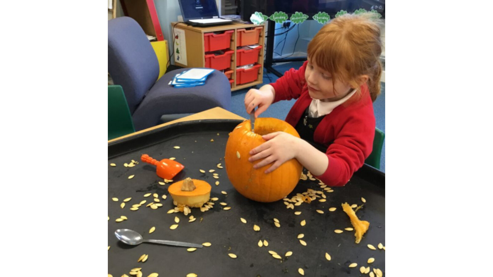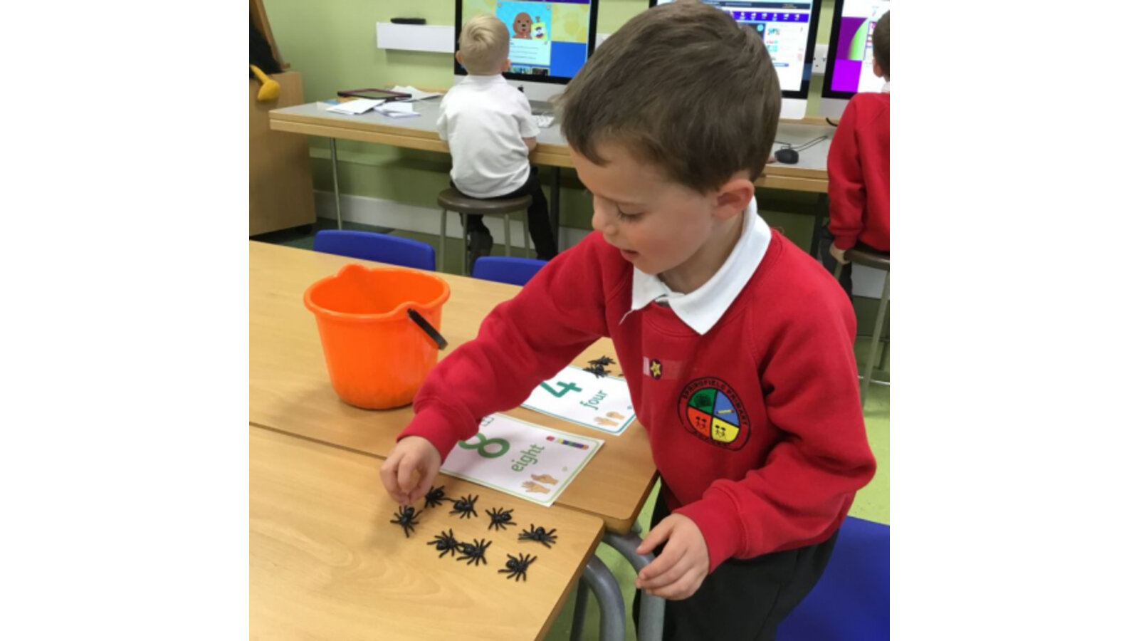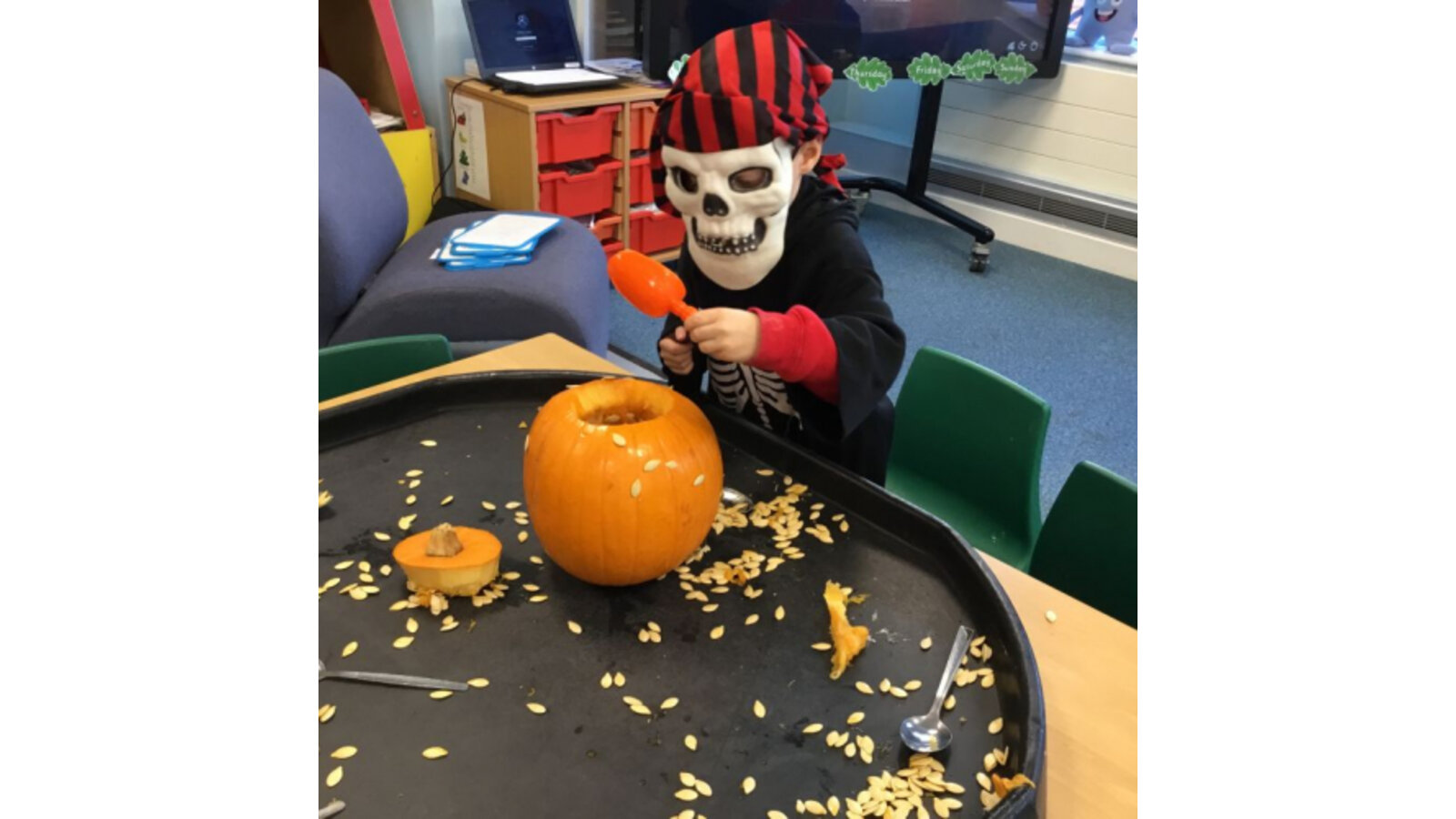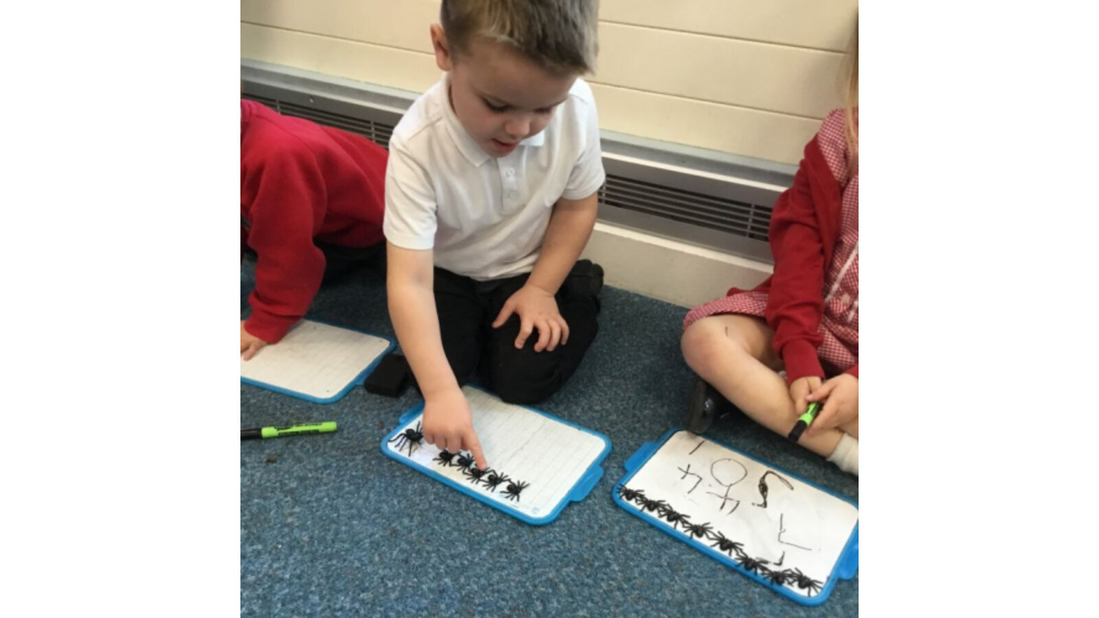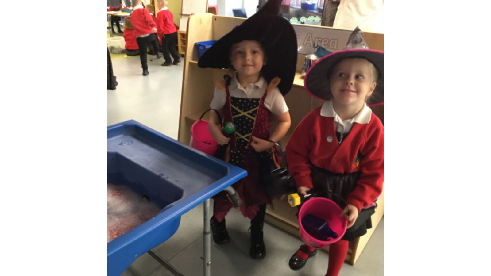 This week we have been reading Room on the Broom by a Julia Donaldson. Lots of the children were familiar with the story already and enjoyed joining in with the parts they knew. We also spotted lots of rhyming words and had fun acting out the story using story spoons. We have shared our Halloween experiences and the children spoke enthusiastically about their costumes. We have been carving pumpkins and exploring their smells and textures. We have also enjoyed cutting up the wiggly worms to different lengths and writing words in the magic dust. We also have some excellent potion makers! In maths we have been counting spiders by lining them up, touching and moving them.