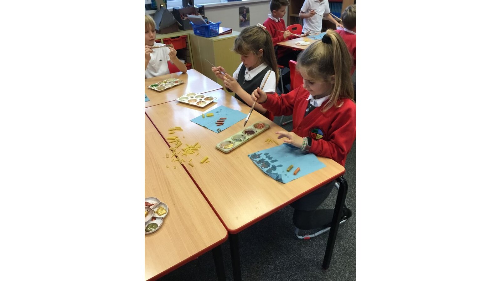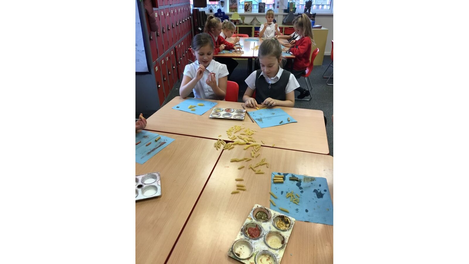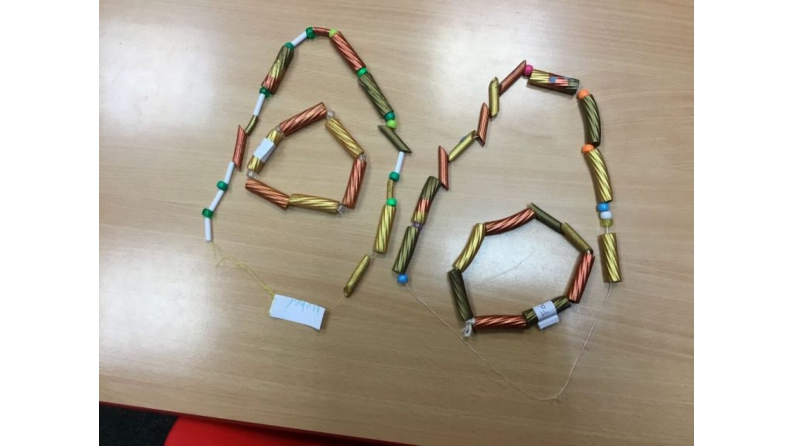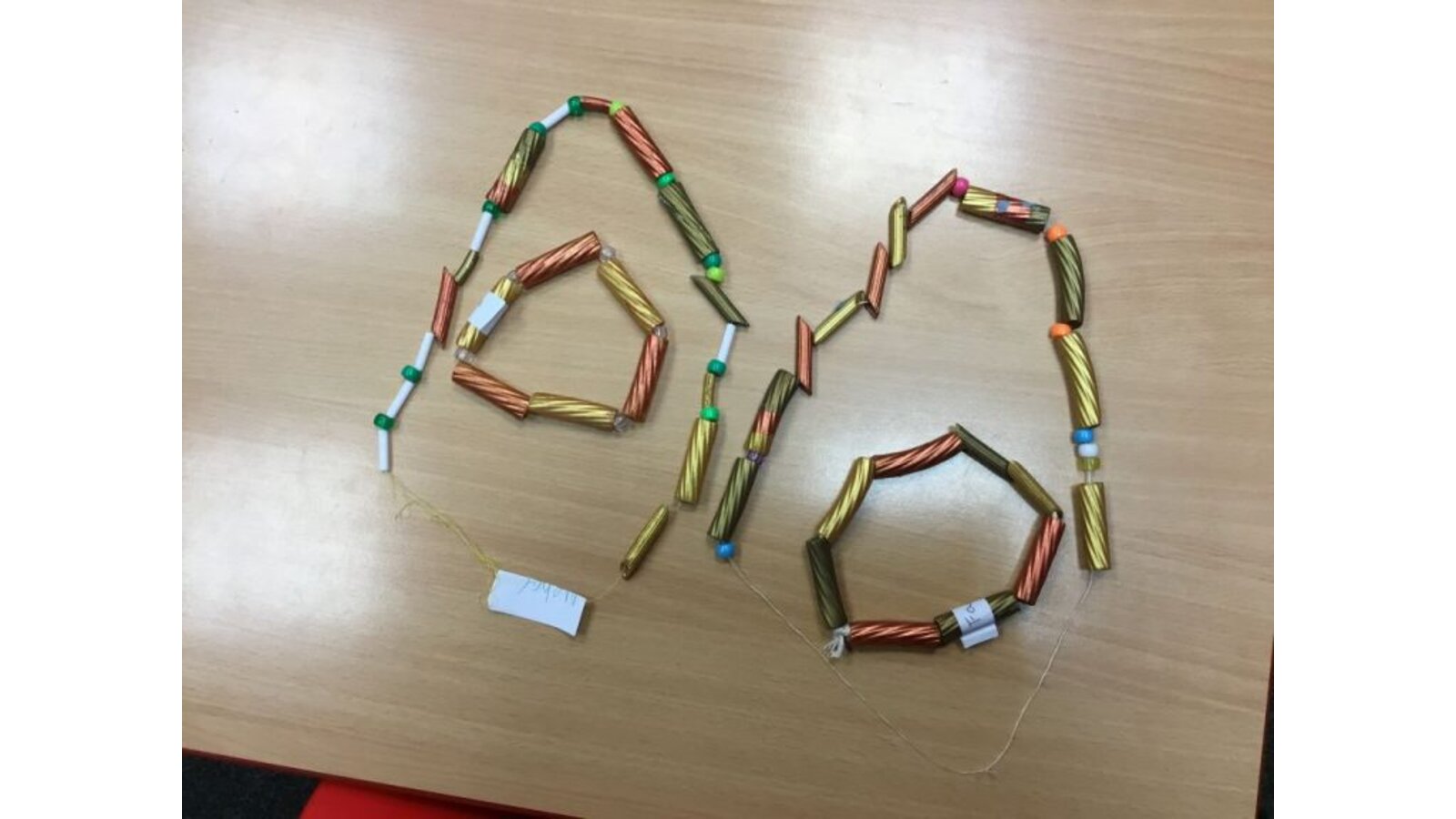 This week the class have created some prehistoric jewellery using pasta, beads and paint. They had fun painting the different types of pasta and choosing some beads but found the thread of needles rather tricky. However, after a few attempts, I think they have made some fabulous pieces of jewellery.