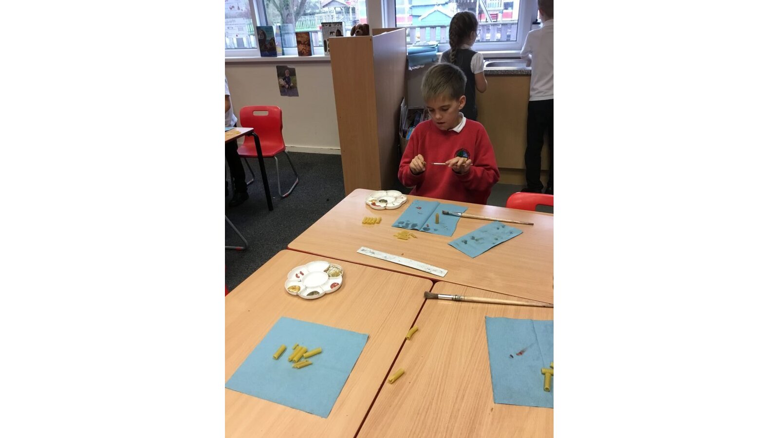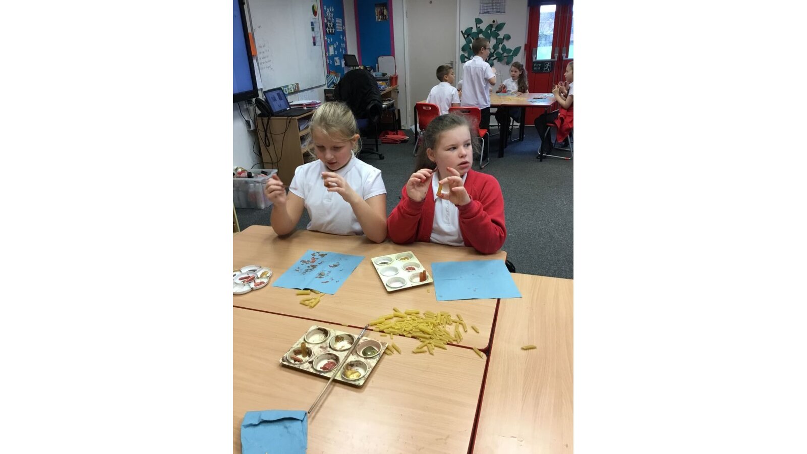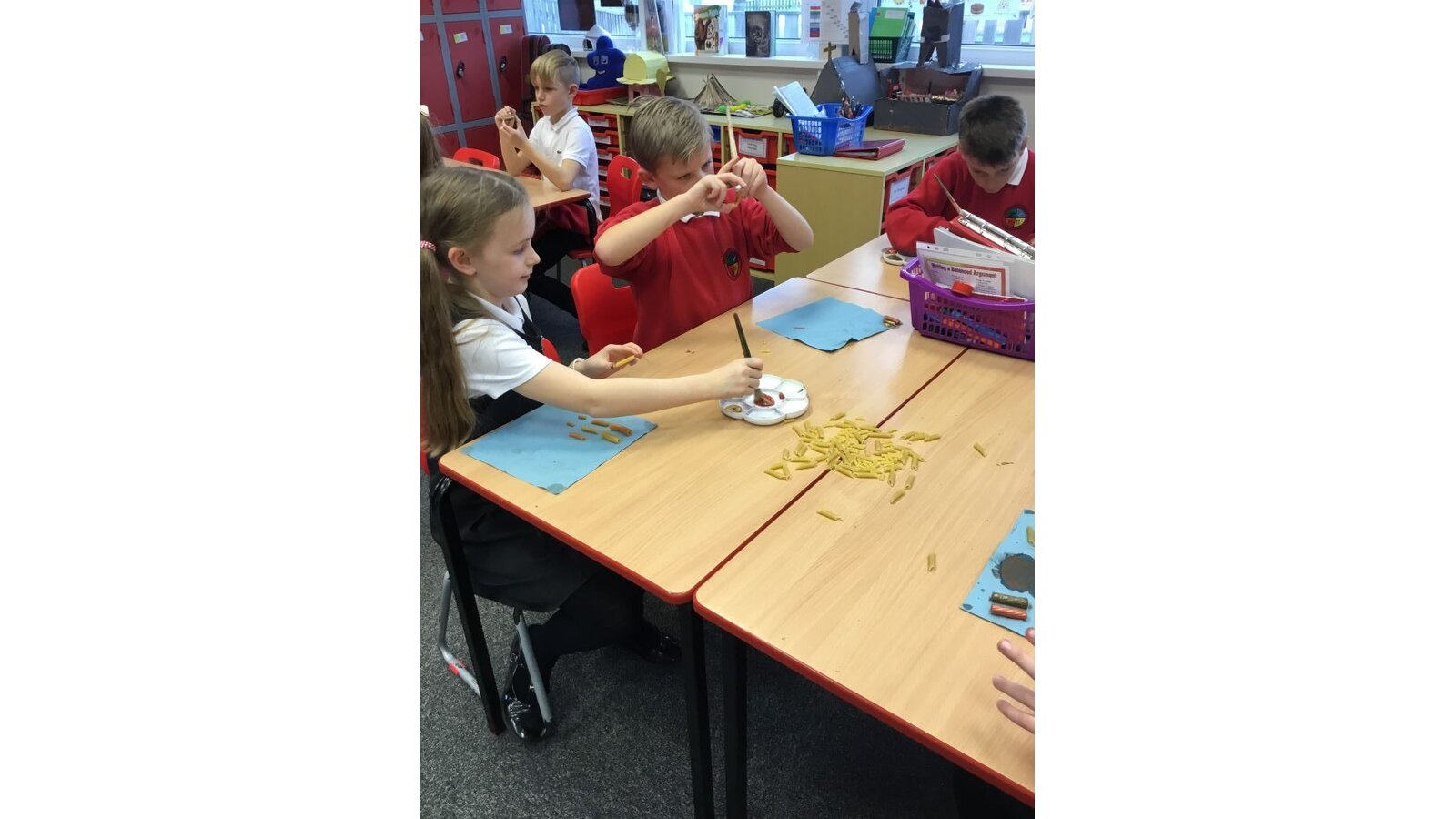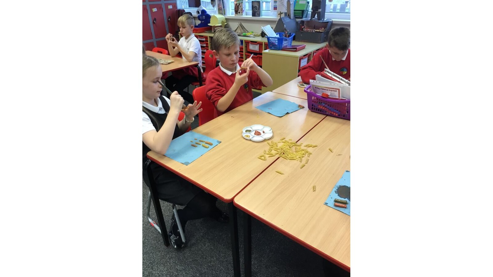 This week the class have created some prehistoric jewellery using pasta, beads and paint. They had fun painting the different types of pasta and choosing some beads but found the thread of needles rather tricky. However, after a few attempts, I think they have made some fabulous pieces of jewellery.