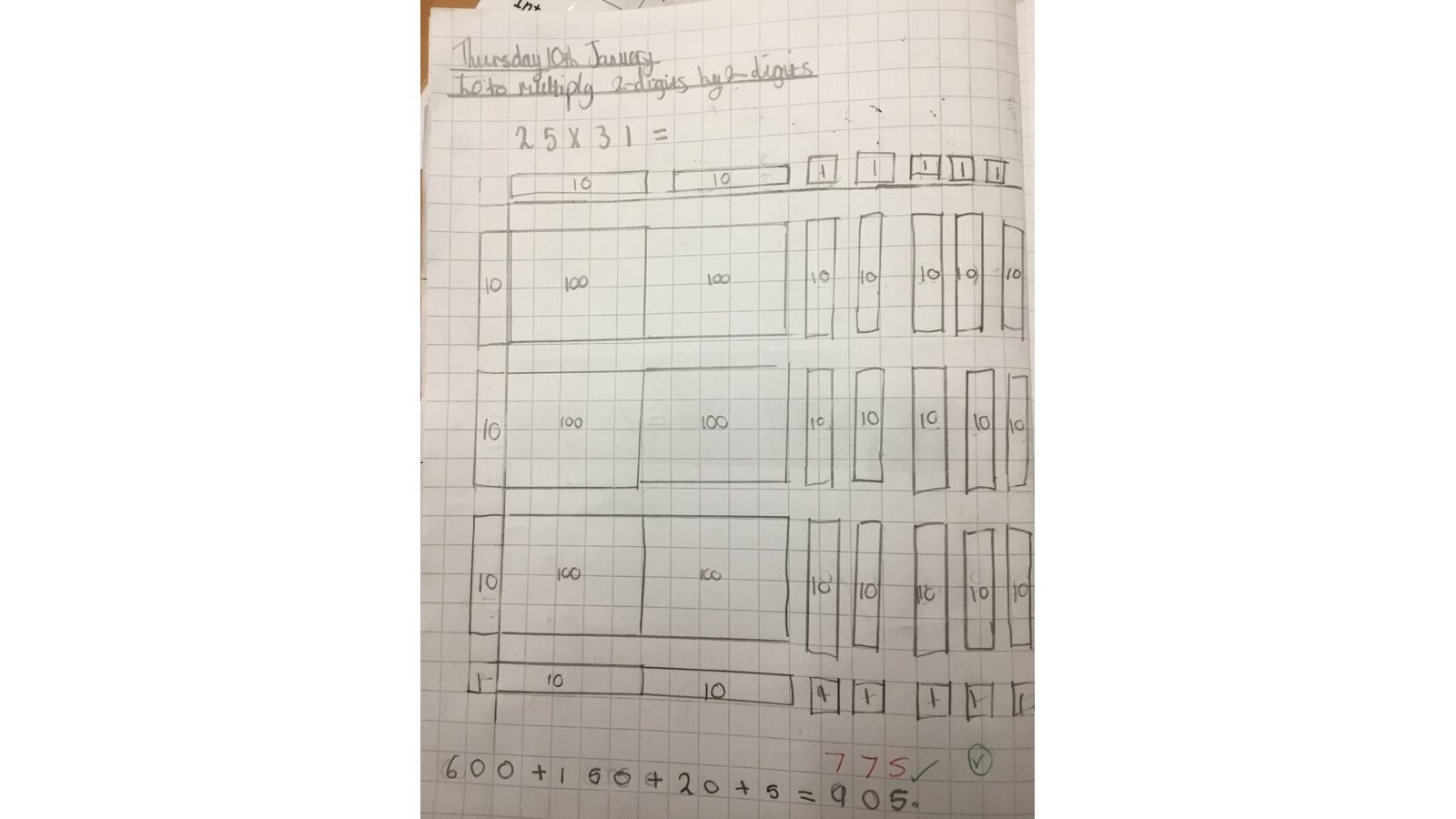 This week, the children have started to multiply two digits by two digits. They began by looking at the area model, which uses base 10 to create a physical multiplication model in order to find the answer.